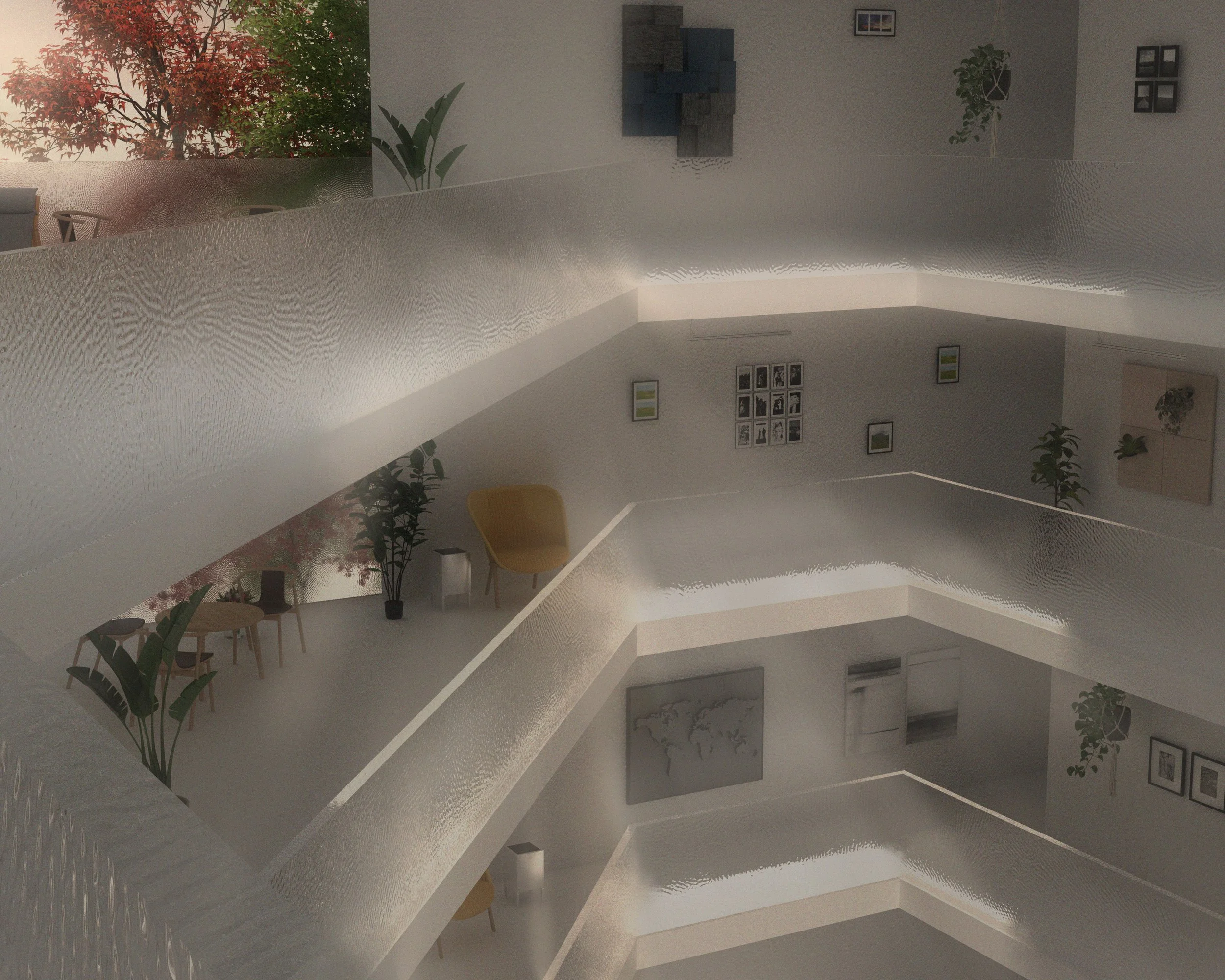 The form of the building, N / dumbbell Shape aims to maximize sunlight and circulation space for occupants while being connected to the building next door. The playfulness and ornamentation of the facade explores timelessness and accessibility for older patients as well as younger generations who occupy the building.